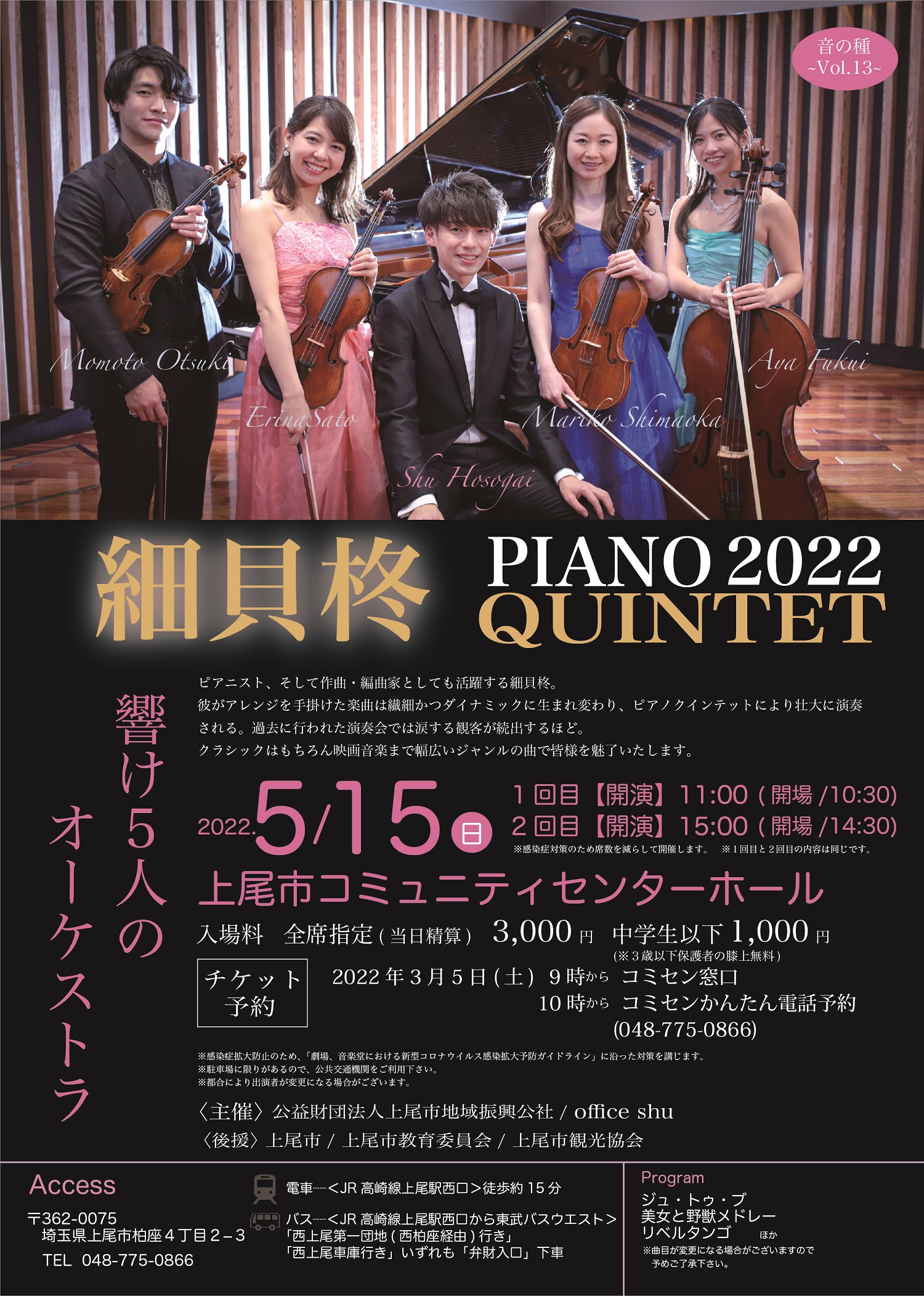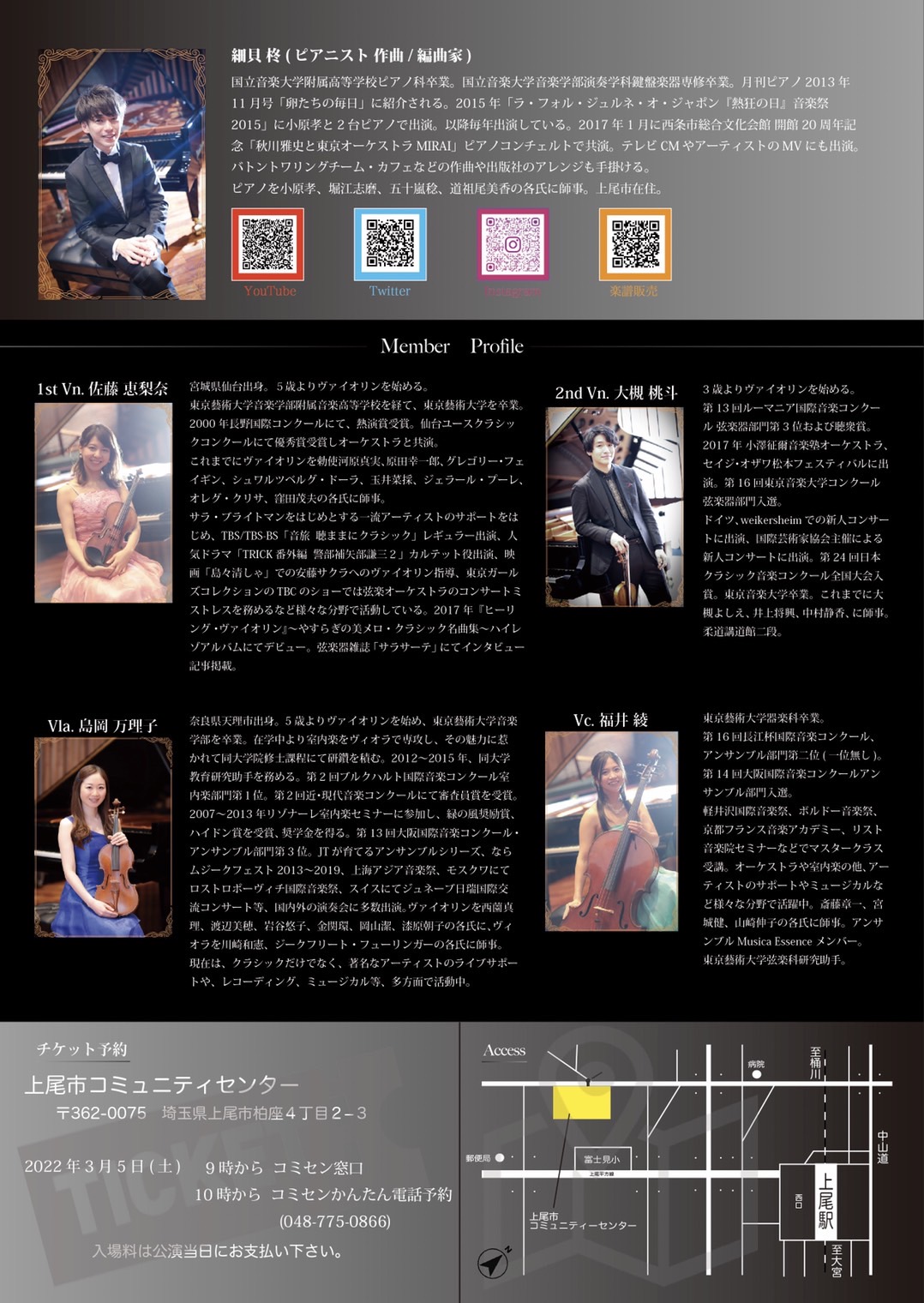 細貝 柊(ピアノ)、佐藤恵梨奈/大槻桃斗(ヴァイオリン)、鳥岡万理子(ヴィオラ)、福井綾(チェロ)