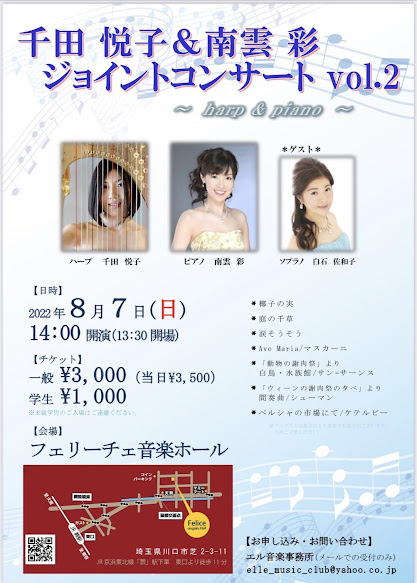 千田 悦子(ハープ)、南雲 彩(ピアノ)、ゲスト:白石 佐和子(ソプラノ)