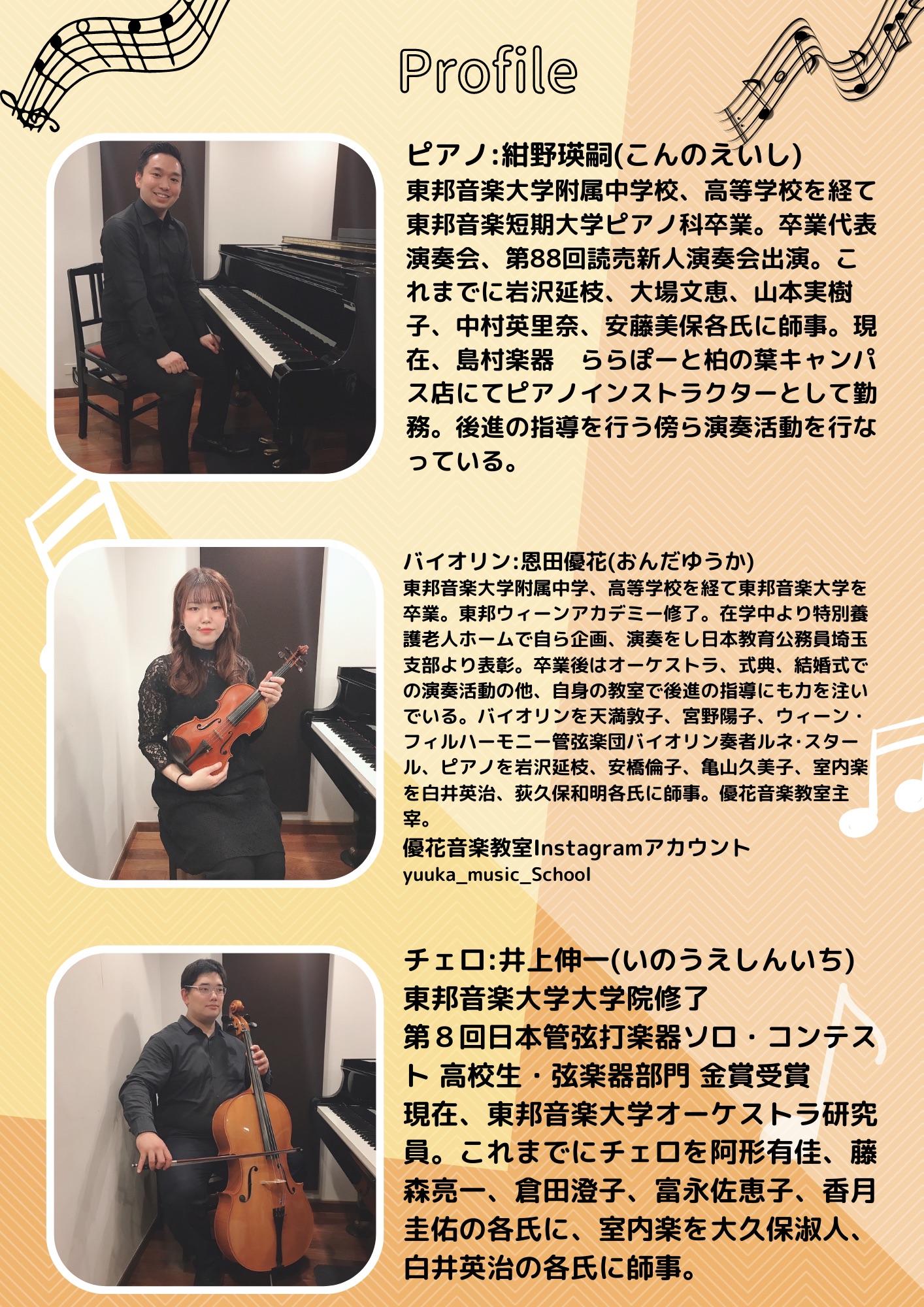 紺野瑛嗣(ピアノ)、恩田優花(ヴァイオリン)、井上伸一(チェロ)