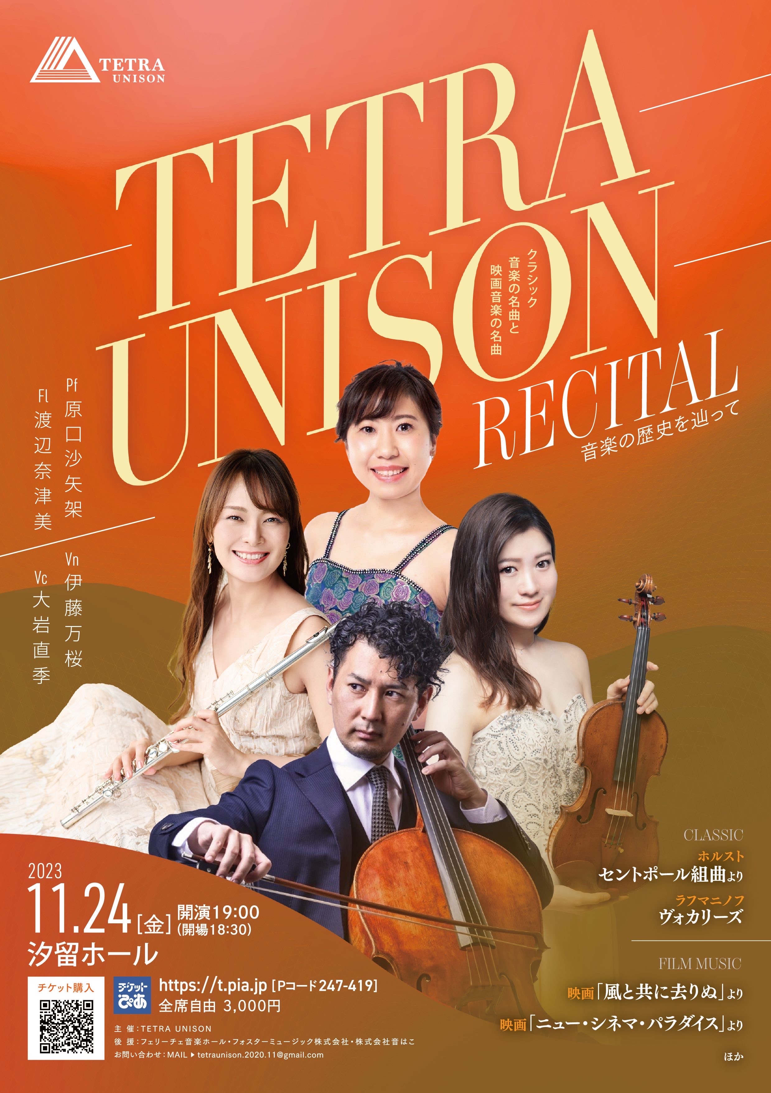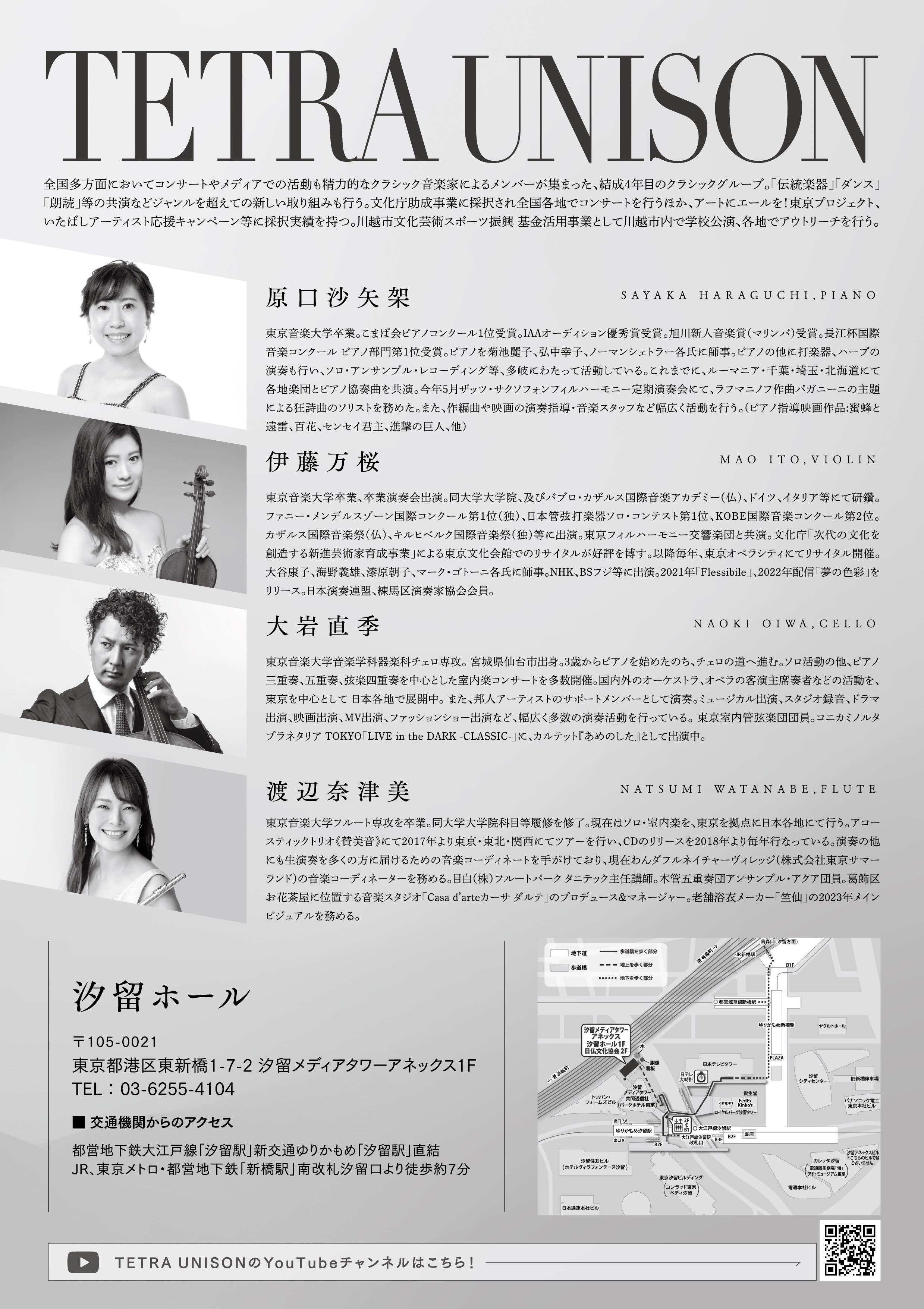 原口沙矢架(ピアノ)、渡辺奈津美(フルート)、伊藤万桜(ヴァイオリン)、大岩直季(チェロ)