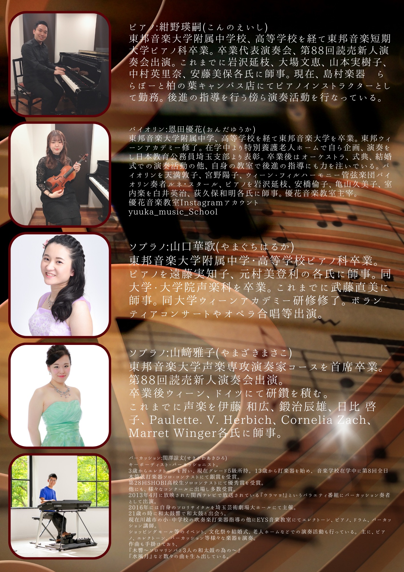 紺野瑛嗣(ピアノ)、山口華歌&山崎雅子(ソプラノ)、関澤諒丈(パーカッション)、恩田優花(ヴァイオリン)